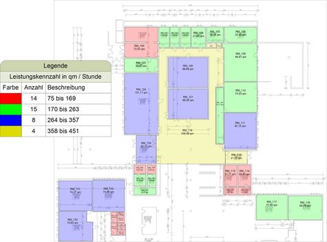 Auswertung der Räume nach Nutzungsart Büroräume und andere unter Berücksichtigung aller Merkmale, die auf die Leistungskennziffer Einfluss nehmen